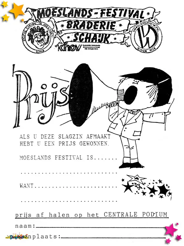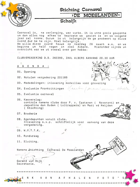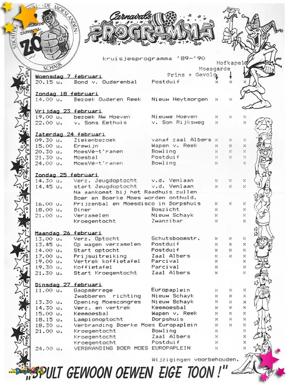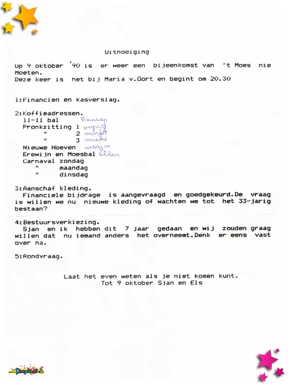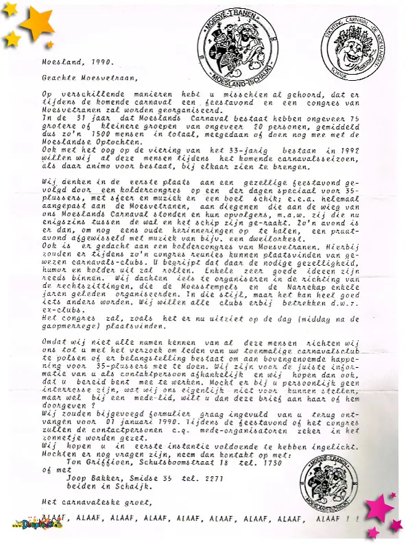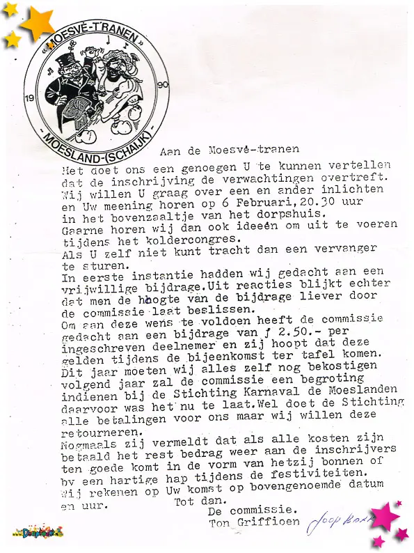 1990 was een jaar waarin het Moesland niet alleen feest vierde, maar ook te maken kreeg met praktische uitdagingen en organisatorische keuzes. De documenten uit dit jaar tonen een mix van financieel bewustzijn, logistieke planning én creatief promotiewerk.