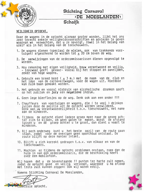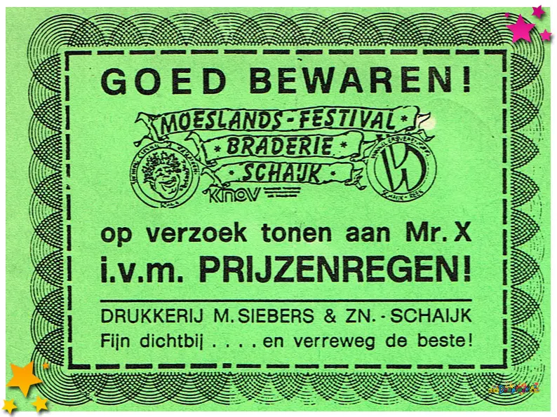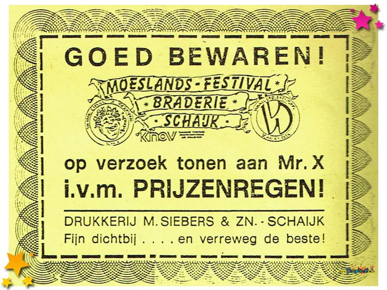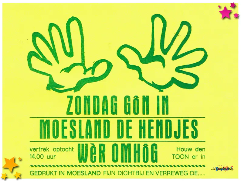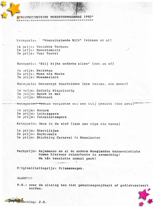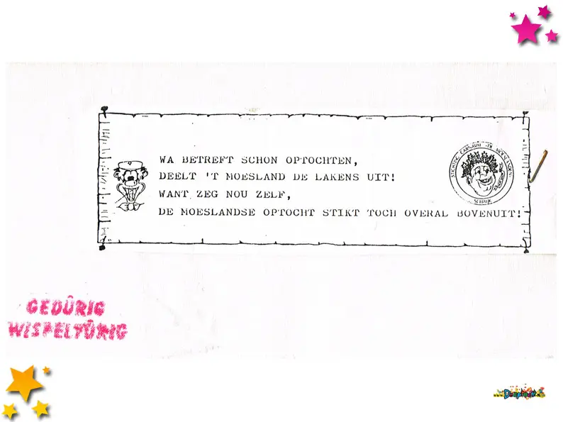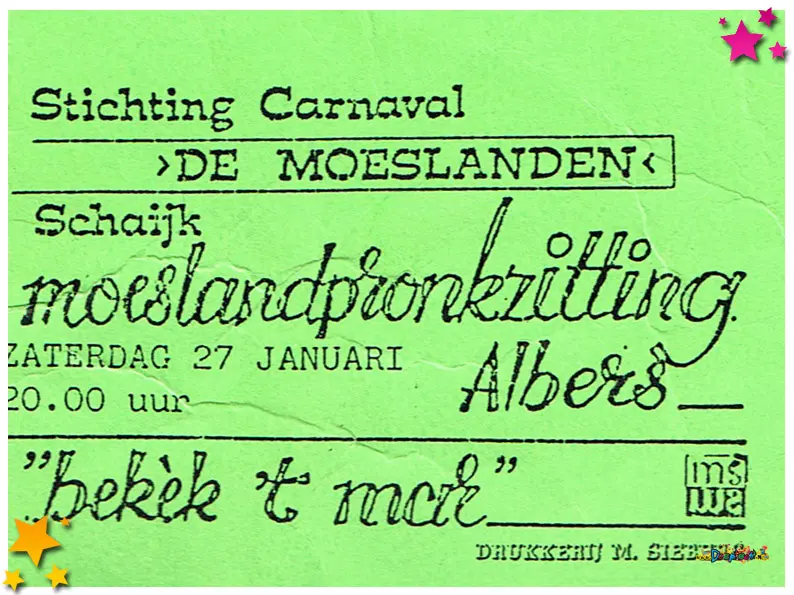 Vanwege slecht weer moest de optocht dat jaar een week worden uitgesteld, een uitzonderlijke situatie die met Moeslandse creativiteit werd aangepakt. Drukkerij Siebers uit Schaijk maakte speciale stickers om de optocht alsnog te promoten. Deze stickers werden in het verspreid om iedereen te informeren én enthousiast te houden. Het laat zien hoe samenwerking tussen lokale ondernemers en carnaval elkaar versterken in moeilijke omstandigheden.