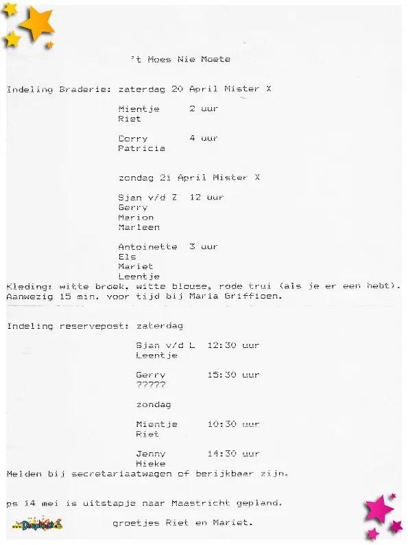 Carnavalsvereniging ’t Moes Nie Moete hielp (net als vele andere carnavalsclubs) mee met de Braderie. Dit was de takenlijst.