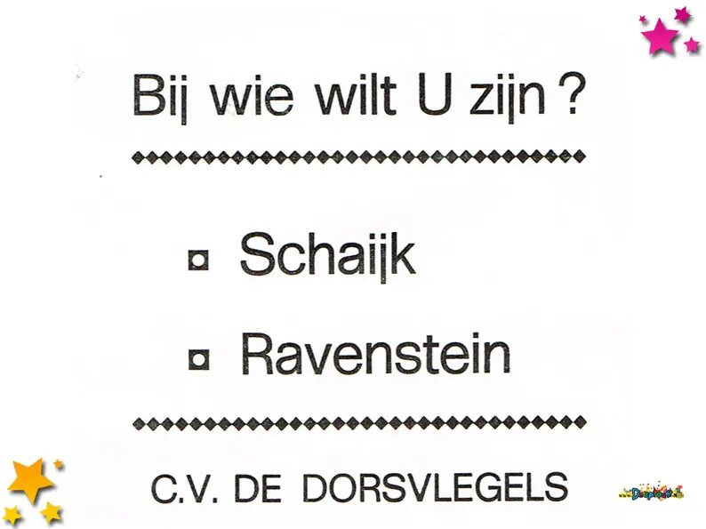 Tijdens de optocht van Schaijk deden de Dorstvlegels ook mee met een wagen. Ze hadden pech dat jaar, een complete pop brak af. Met het idee “Schampers verdeelt er op los, landje prikke tussen Combee en Vos” werden ze tiende. Tijdens de optocht werden deze formuliertjes uitgedeeld.