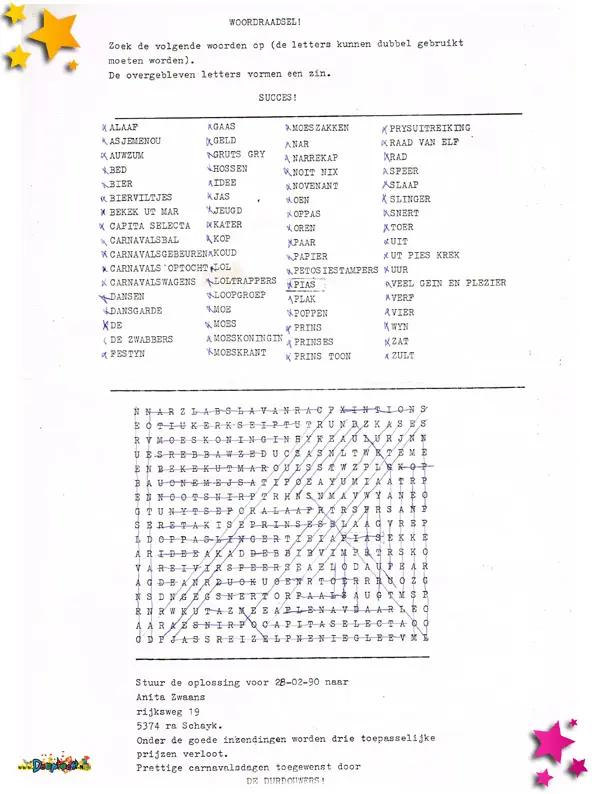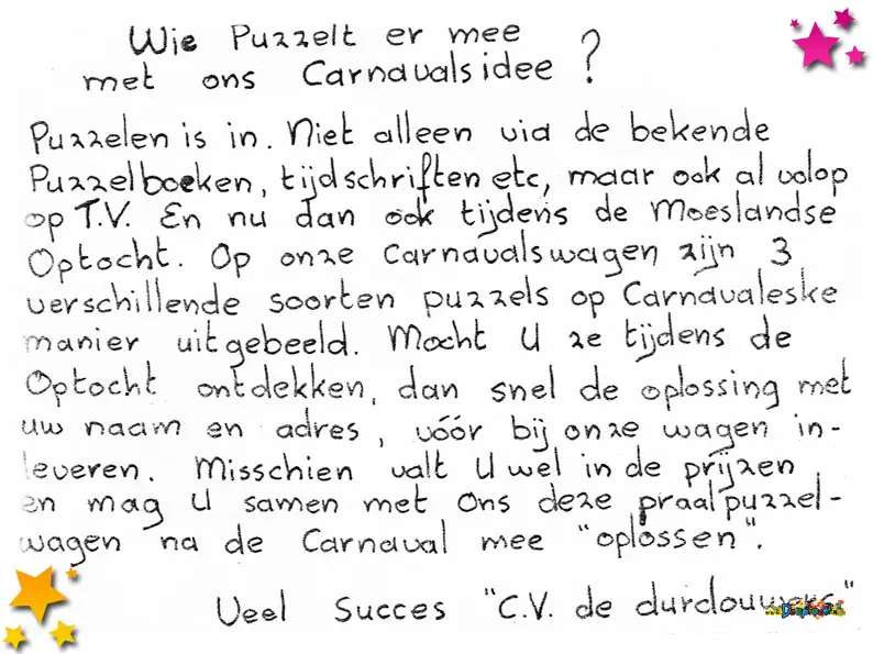 Ook de Durdouwers deden mee met een wagen aan de optocht van Schaijk. Met hun idee ” 3 Puzzels op een wagen, oplossen doe we ze na de carnavalsdagen” werden ze achtste. Tijdens de optocht werden deze formuliertjes uitgedeeld.