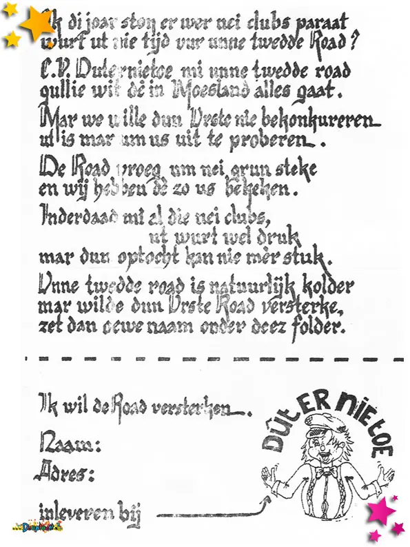 Er komen ieder jaar weer nieuwe carnavalsclubs bij. Zo ook in 1990. Dat was de inspiratie voor carnavalsvereniging Duternietoe om daar hun wagen op te baseren. Met “Ok di joar stoan er wer nei clubs paraat wordt ut nie host tijd vur unne twedde raad?” werden ze tweede in de optocht van 1990. Tijdens de optocht werden deze formulieren uitgedeeld.
