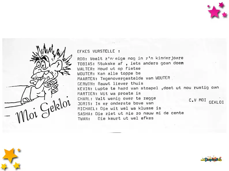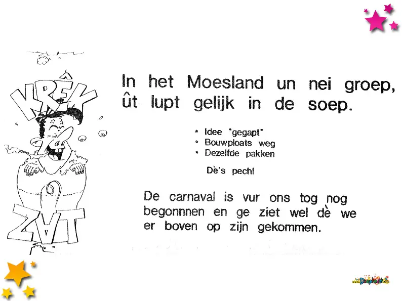 Carnavalsvereniging Moi Gekloi deed in 1990 voor het eerst mee aan de grote Moeslandse optocht. Met “Voor het eerste jaar een wagen was een zooi, maar we heten niet voor niets Moi Gekloi” werden ze twaalfde bij de wagens.
