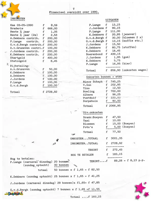 Iedere carnavalsclub werkt met een begroting. Zo ook de Bierviltjes. Dit was een financieel overzicht van 1990.