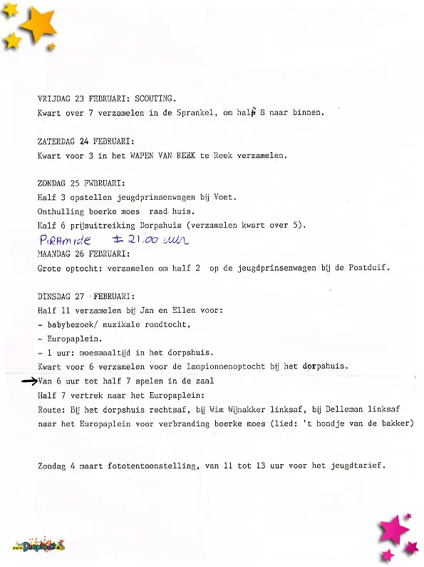 Het carnavalsprogramma voor jeugdhofkapel de Moesbloazers.