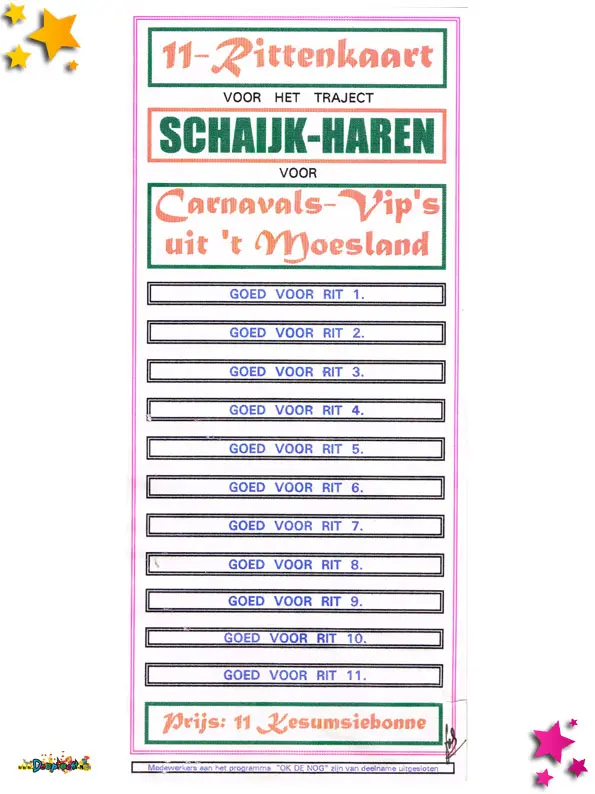 Een 11-rittenkaart voor het traject Schaijk – Haren. En dan ook nog voor de zogenaamde Carnavals-vips’ uit het Moesland. Mij is niet bekend waar het voor gebruikt is. Mocht jij dat wel weten… Mail dan naar info@deoptocht.nl.