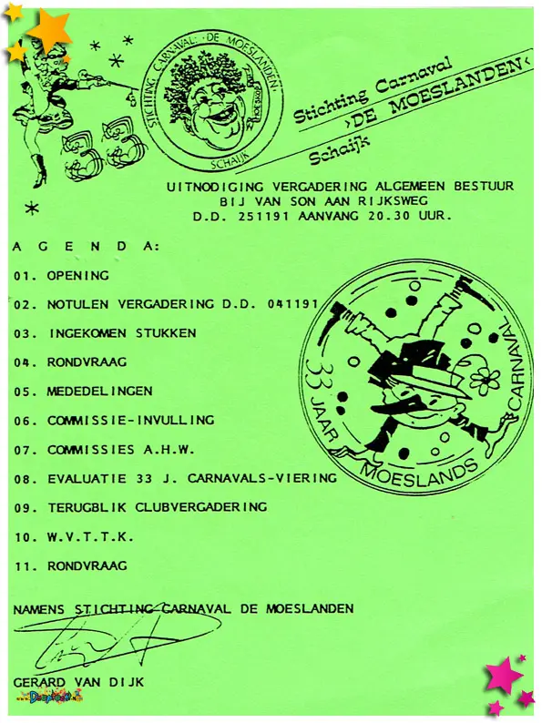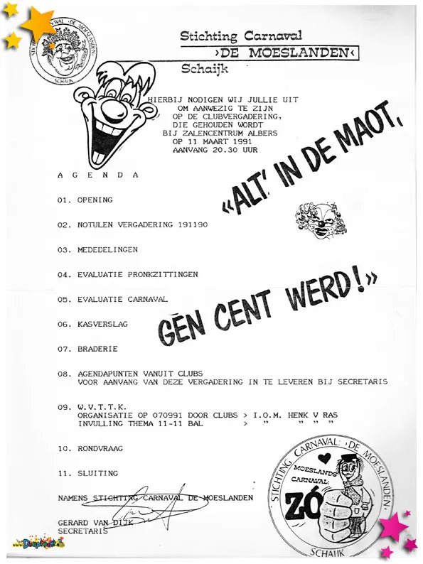 Uitnodiging en agenda voor de clubvergadering van Stichting Carnaval de Moeslanden.