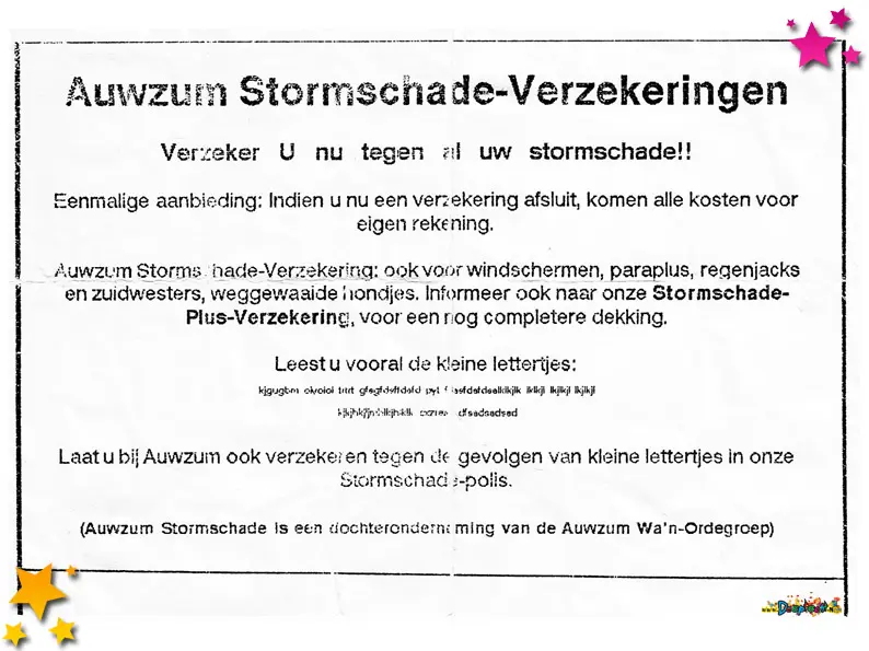 Naar aanleiding van de storm tijdens carnaval 1990 had Auwzum in 1991 deze kaartjes uitgedeeld. Nu kon je jezelf verzekeren bij Auwzum Stormschade verzekeringen.