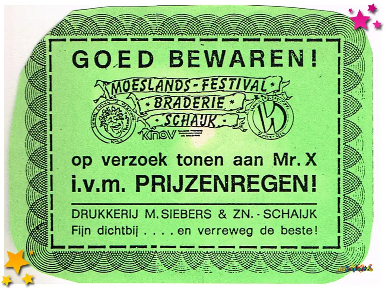 Tijdens de braderie worden er veel prijzen weggegeven. Als je tijdens de braderie door Mister x werd aangesproken en je kon dit kaartje overleggen dan won je prijzen.