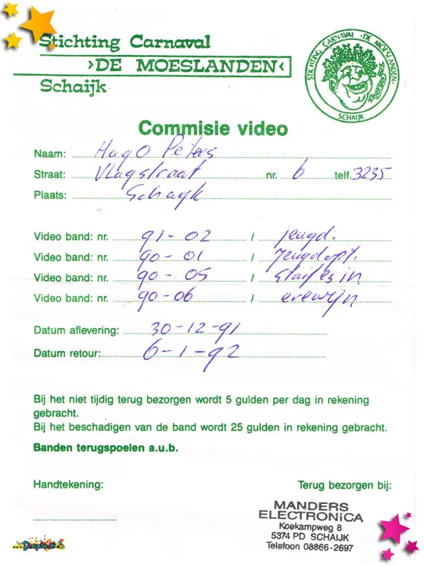 Als je videobanden van Stichting carnaval wilde lenen om thuis te kijken moest je een briefje invullen. Die zagen er zo uit.
