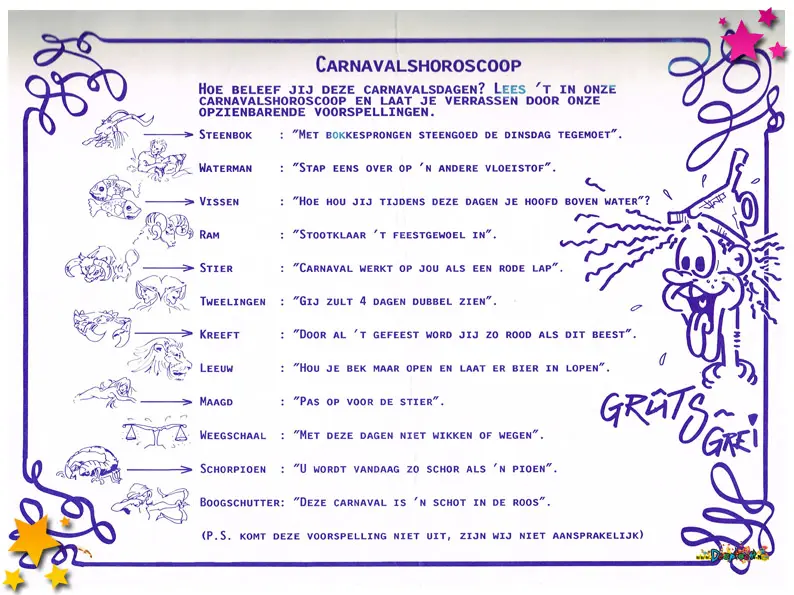 Tijdens de optocht van 1991 nam carnavalsvereniging Grûts Grei deel met het idee “Onze carnavalshoroscoop voorspelt van leeuw tot kreeft, hoe gullie deez carnaval beleeft”.