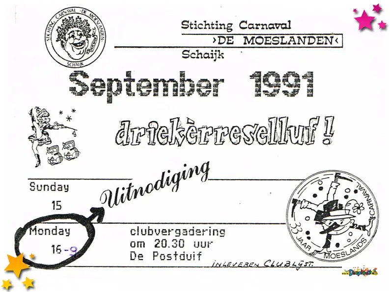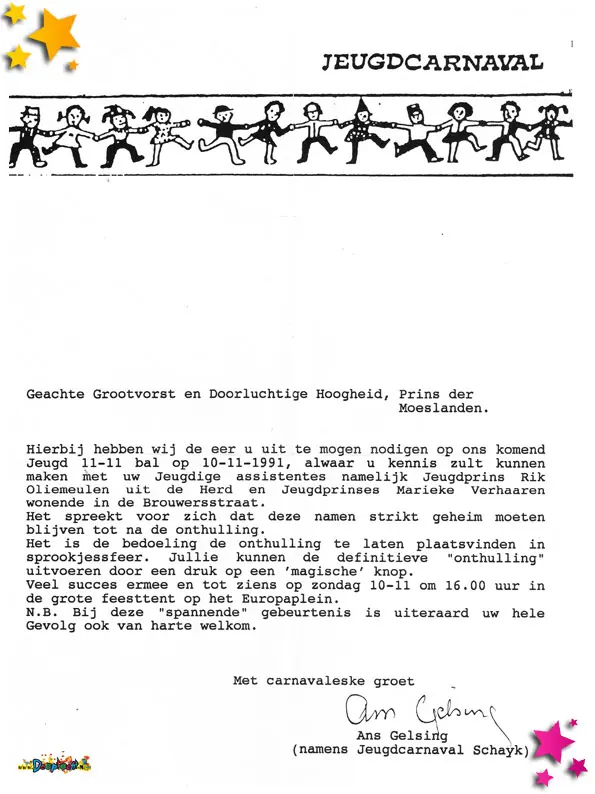 Jeugdcarnaval Schaijk stuurde in 1991 een officiële uitnodiging voor het jeugd 11-11-bal naar de grootvorst en de Prins der Moeslanden.