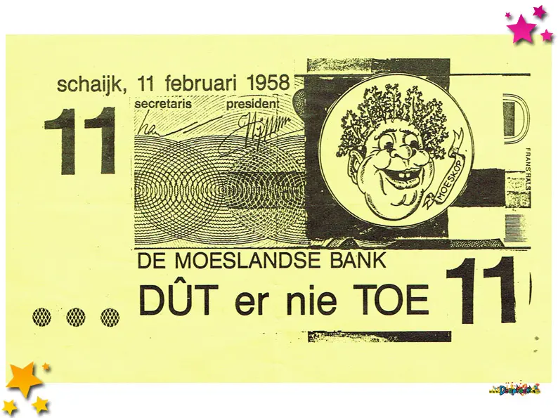 Tijdens de optocht van 1991 nam carnavalsvereniging Dûternietoe deel met het idee “Mi carnaval dut al da Moeslandsbier ut spaarverken toch wel zier”. Bij de wagens werden ze daarmee negende. Tijdens de optocht werden deze 11 guldenbiljetten uitgedeeld.
