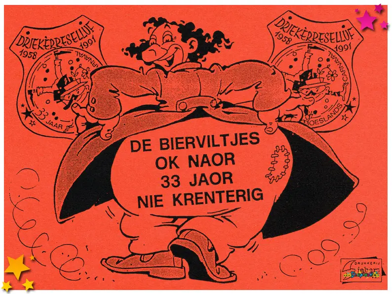 Niet alleen Stichting Carnaval de Moeslanden bestond in 1991 33 jaar, ook carnavalsvereniging de Bierviltjes vierden hun 33-jarig bestaan. Dat deden ze onder andere met het uitbrengen van deze stickers.
