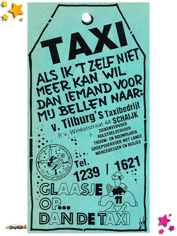 Taxibedrijf van Tilburg had in 1991 een ludieke reclame verzonnen voor de carnavalsdagen. Dit kaartje kon je met een touwtje om je nek hangen. Altijd handig 😉
