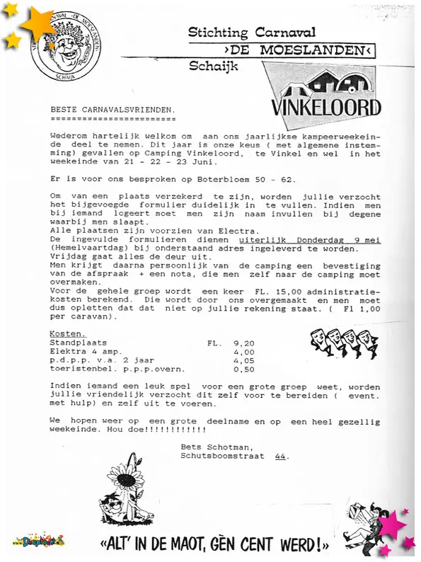 De uitnodiging voor het jaarlijkse weekendje weg van Stichting Carnaval de Moeslanden in Schaijk.