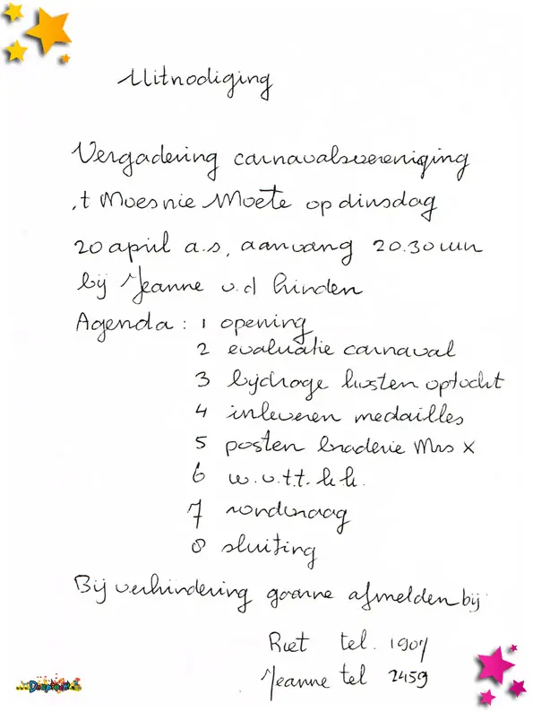 De uitnodiging en agenda voor een vergadering van carnavalsvereniging ’t Moes Nie Moete.