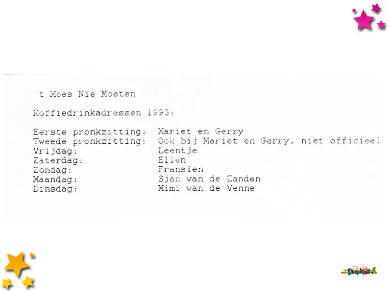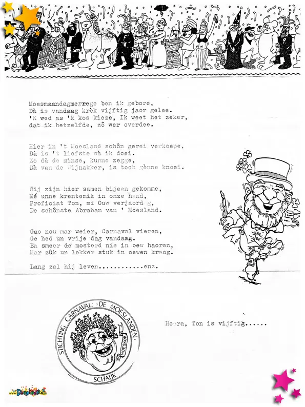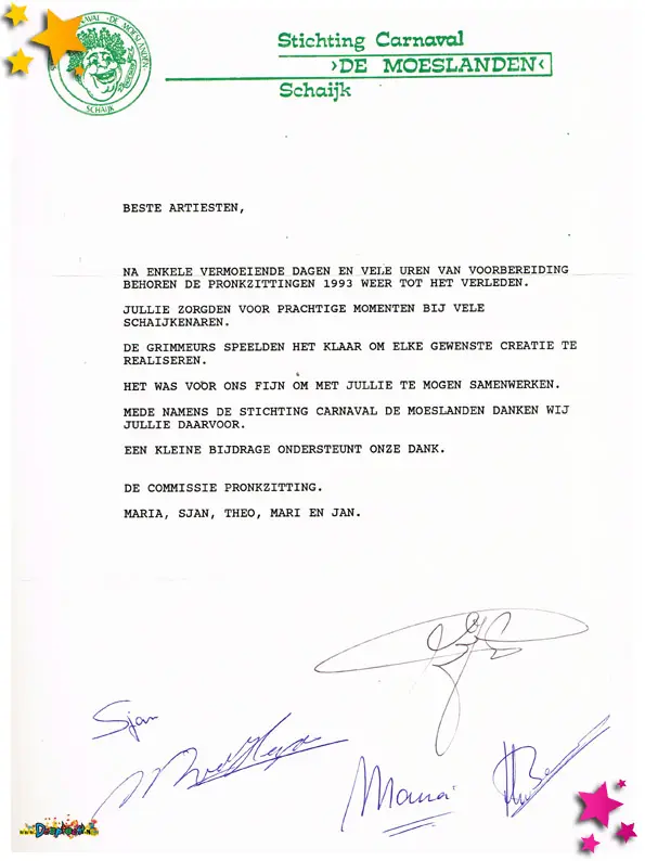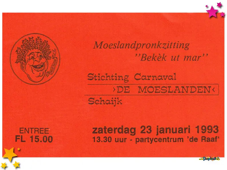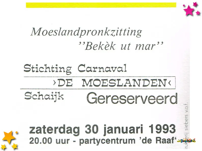 Carnavalsvereniging Môi Geklôi deed in 1993 mee aan de optocht in de categorie wagens. Met “Moesland zing me ons mee, we goan di joar me carnaval in zee” werden ze tweede. Tijdens de optocht werden deze flyers uitgedeeld.