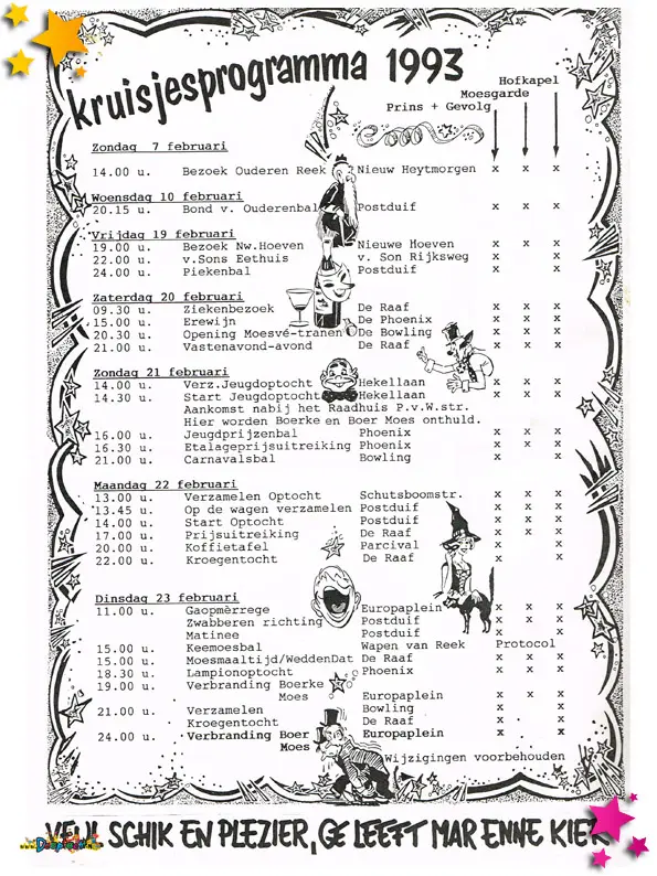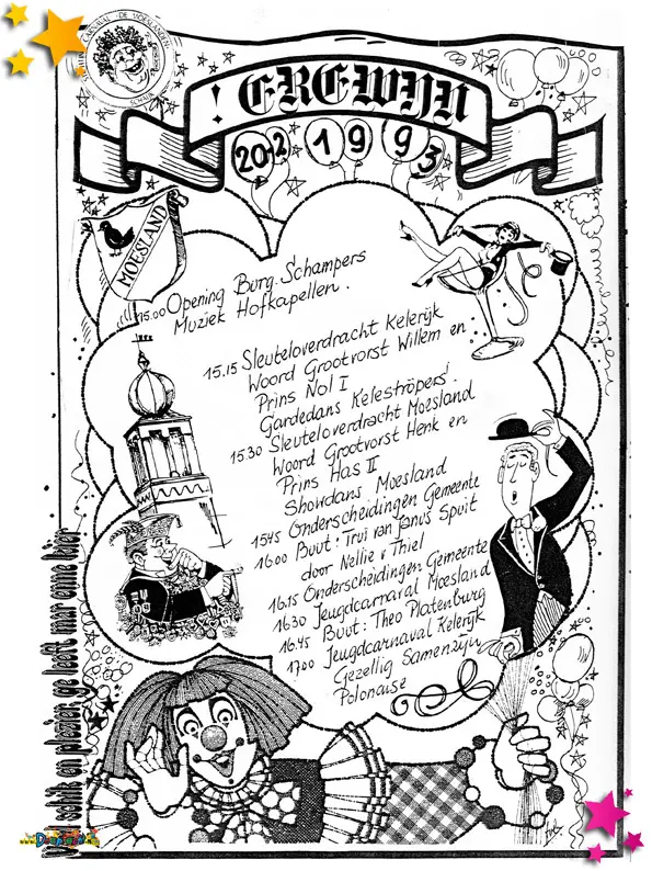 1993 was een jaar waarin carnaval in het Moesland verder reikte dan de optocht alleen. Het hele dorp deed mee, van ondernemers tot wijnliefhebbers, en het jaar eindigde met een warm en waardig afscheid van een markante voorzitter.