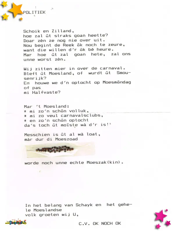 Carnavalsvereniging Ôk Nôch Ôk deed in 1993 mee aan de optocht in de categorie wagens. Met “Schaijk met Zeeland geeft met carnaval wel wat laste, doen we de optocht op Moesmaandag of op Halfvasten” werden ze vijfde. Tijdens de optocht werden deze flyers uitgedeeld, met echt Boeremoeszaad.