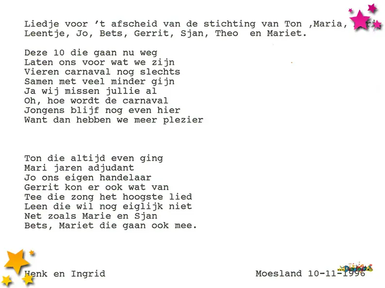 Een bedankje voor de artiesten en deelnemers aan de pronkzitting van 1996.