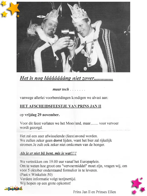 Uitnodiging voor het afscheidsfeestje van Prins Jan II.