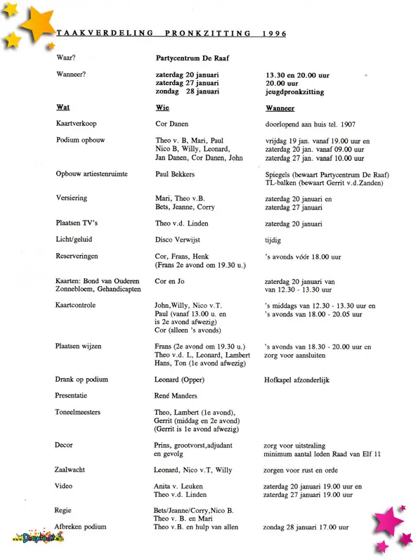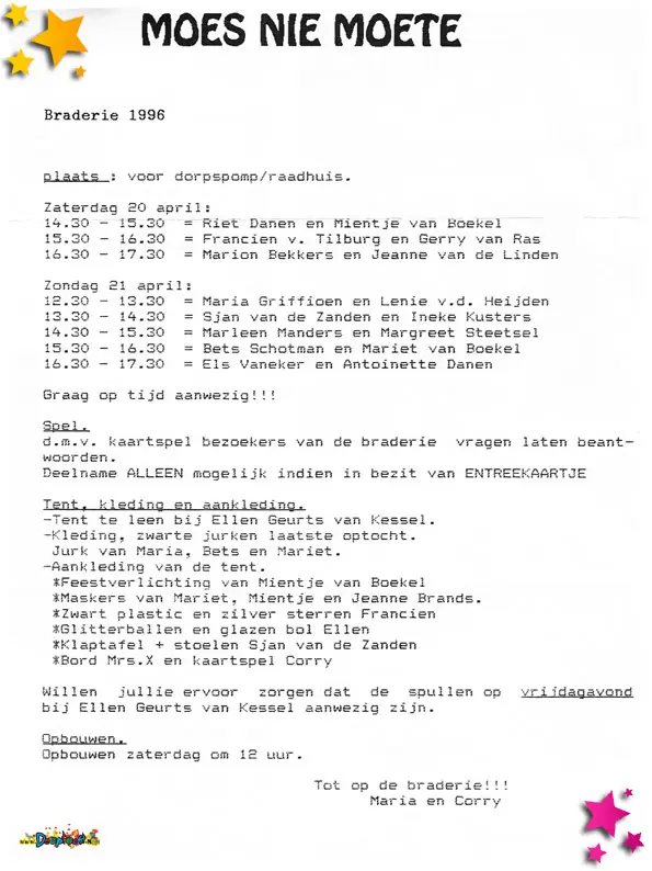 De planning voor de leden van ’t Moes Nie Moete voor de braderie van 1996.