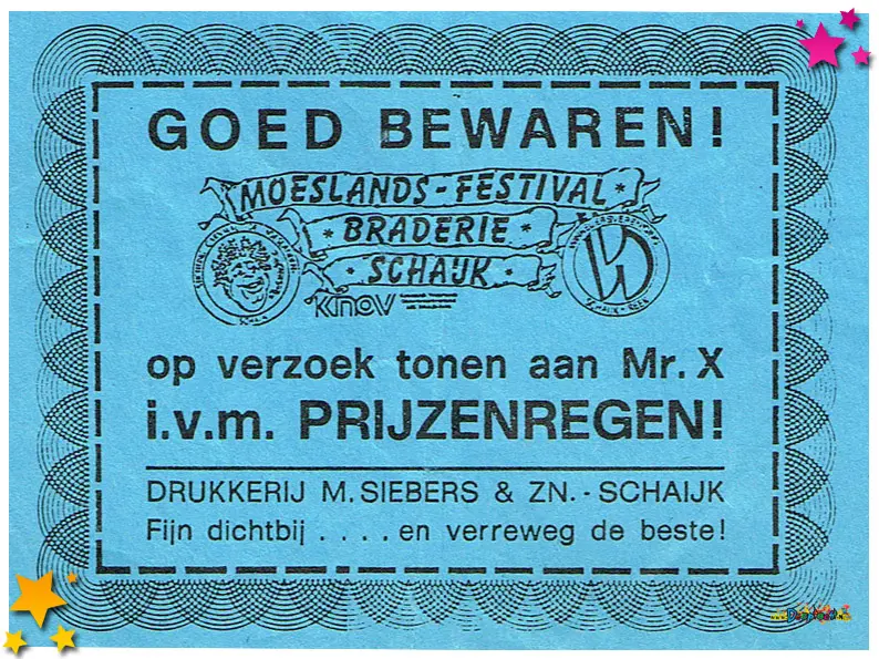 Een bijzonder document uit dit jaar is de originele consumptiebon van Stichting Carnaval De Moeslanden. In die tijd had elke carnavalsclub eigen consumptiebonnen, die tijdens carnaval konden worden ingewisseld bij de Schaijkse horeca. Het systeem zorgde ervoor dat feestvierders konden genieten van hun drankjes, terwijl de clubs hun eigen identiteit op de bonnen konden zetten.