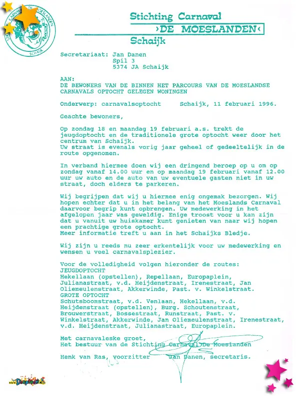 Een brief van Stichting Carnaval de Moeslanden voor de omwonenden aan de route van de optochten.