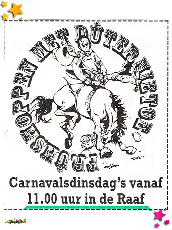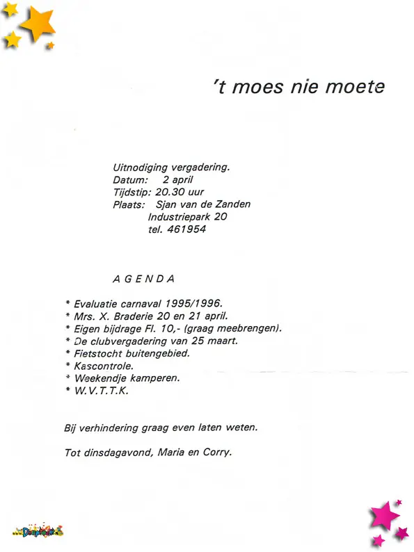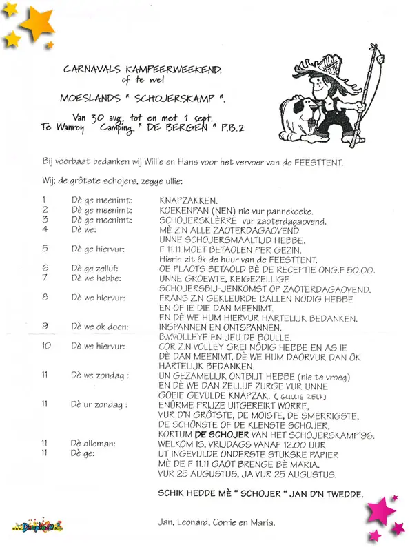 De uitnodiging voor het jaarlijkse weekendje voor leden van Stichting Carnaval de Moeslanden.