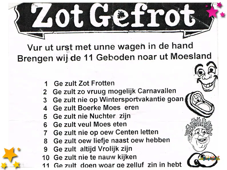 Carnavalsvereniging Zot Gefrot deed mee aan de optocht van 1996 in de categorie wagens. Met “Vur ut urst met un wagen in de hand, brengen wij de Elf geboden van ut Moesland” werd de eenentwintigste plaats bereikt.