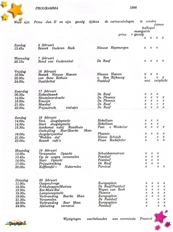 1996 was een jaar waarin het Moesland liet zien dat het carnaval niet alleen een feest is, maar ook een kwestie van goede organisatie en het koesteren van nieuwe tradities.