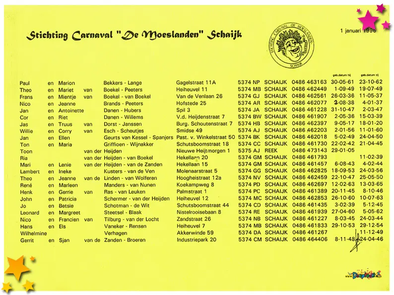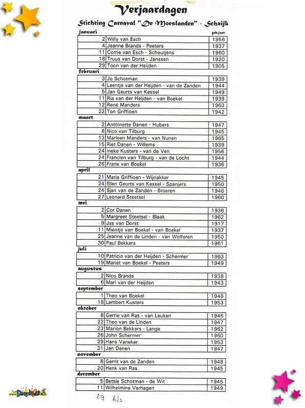 De verjaardaglijst van de leden van Stichting Carnaval de Moeslanden.