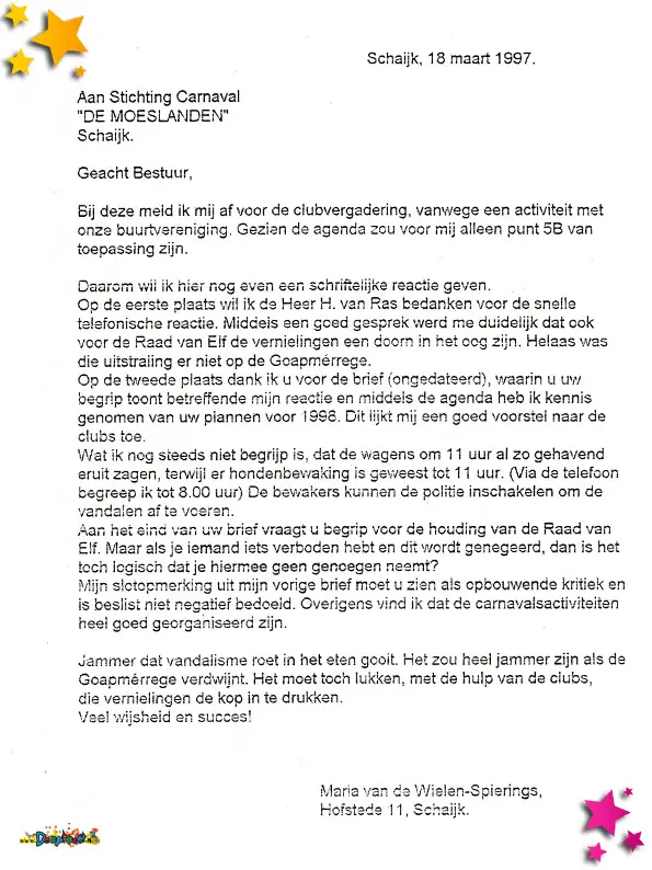 Daarnaast verscheen er dat jaar een ingezonden brief over het slopen van carnavalswagens tijdens de Goapmerrege. De oproep was helder: het is niet nodig om de wagens moedwillig te vernielen, zeker niet gezien de tijd, liefde en moeite die clubs erin steken. Het document is een mooi voorbeeld van hoe binnen het Moesland ruimte is voor zelfkritiek, én voor het bewaken van het respect voor elkaar en elkaars werk.