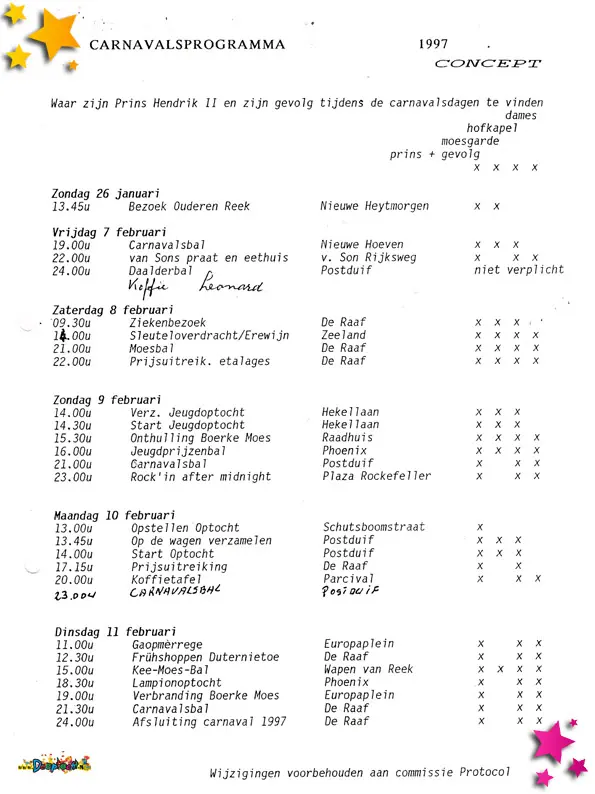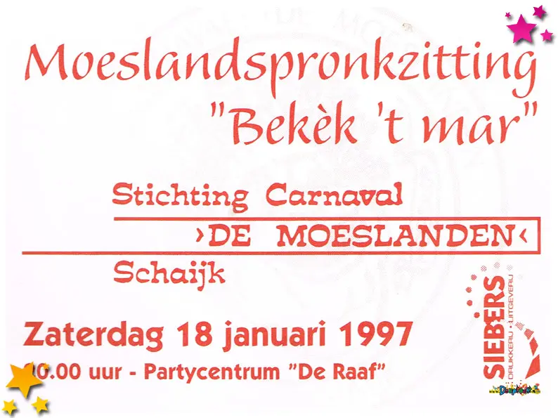 1997 was een jaar waarin het Moesland liet zien dat carnaval draait om plezier én respect, en dat fouten gemaakt mogen worden, zolang ze maar sportief en eerlijk worden rechtgezet.