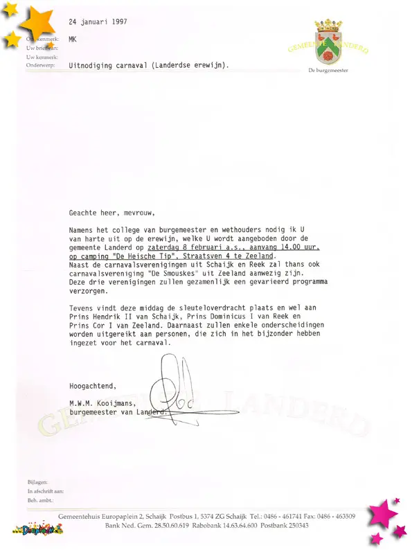 De officiële uitnodiging voor de Erewijn van de Gemeente Landerd.