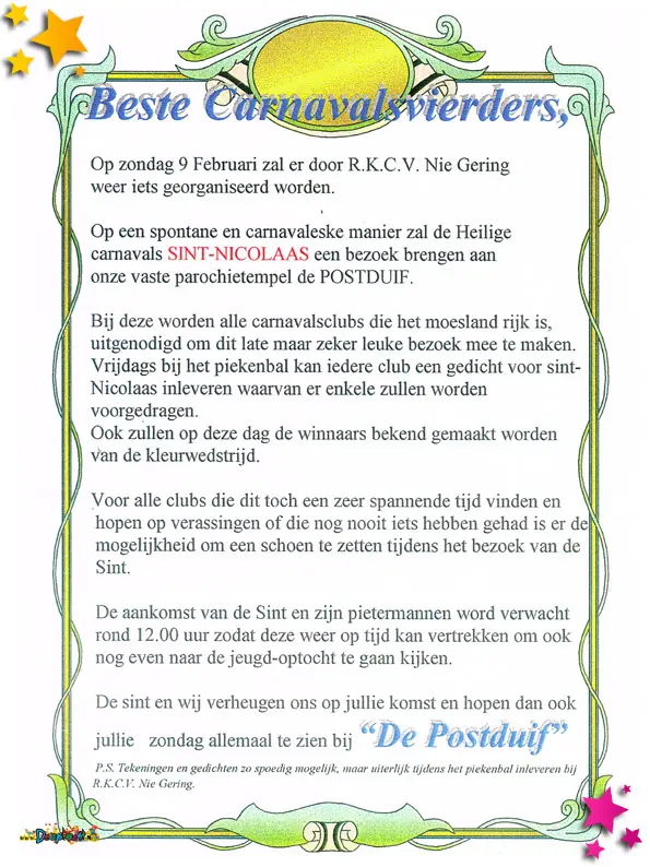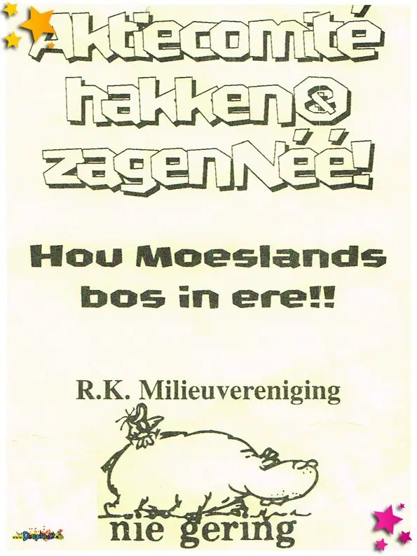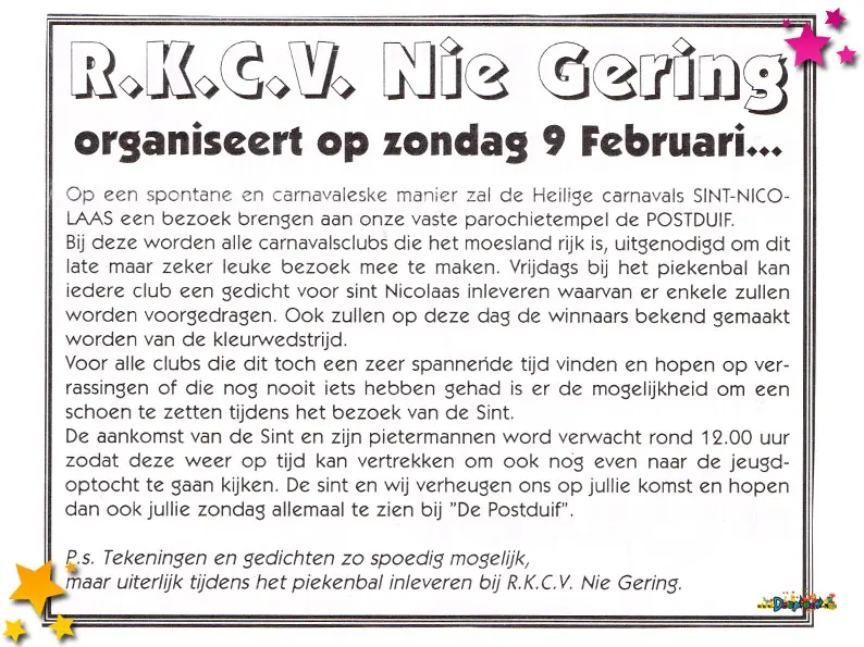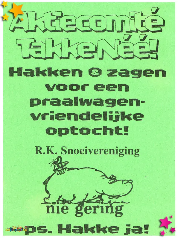 In 1997 deed R.K.C.V. Nie Gering mee aan de optocht in de categorie wagens. Met “Gabbertjes zagen en hakke, di joar make ze mi ons Moesland route vrij van takke” werd er een derde plaats bereikt. Tijdens de optocht werden deze flyers uitgedeeld. En er werd ook daadwerkelijk gesnoeid om de route “wagenvriendelijk” te maken. Iets waar Stichting Carnaval De Moeslanden destijds niet zo mee kon lachen. Maar wij wel 😉