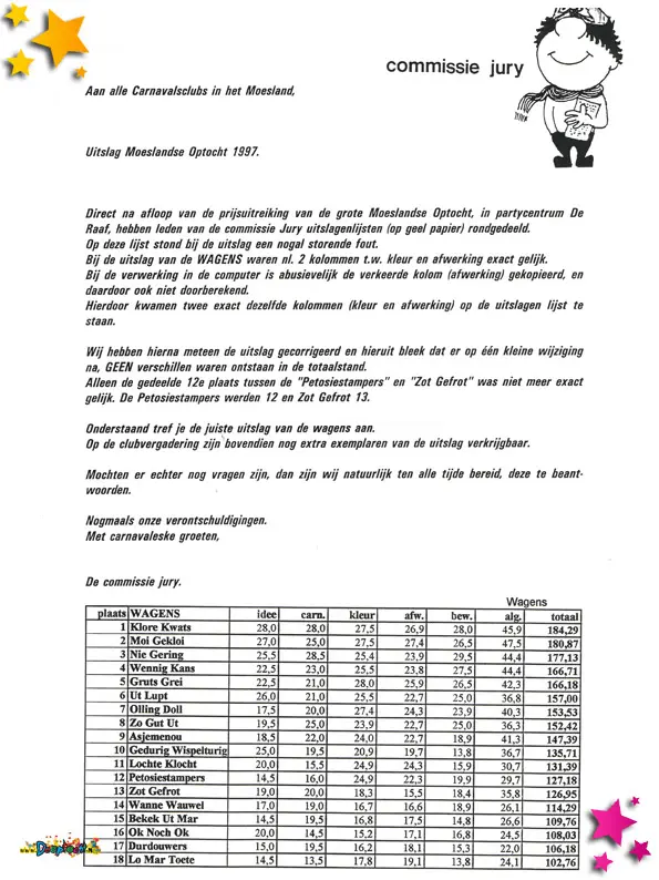 De jury deelde per brief mee dat de uitslag van de optocht van 1997 werd aangepast.