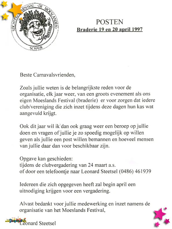 Een oproep vanuit Stichting Carnaval de Moeslanden naar de verschillende clubs om te helpen bij de braderie van Schaijk.