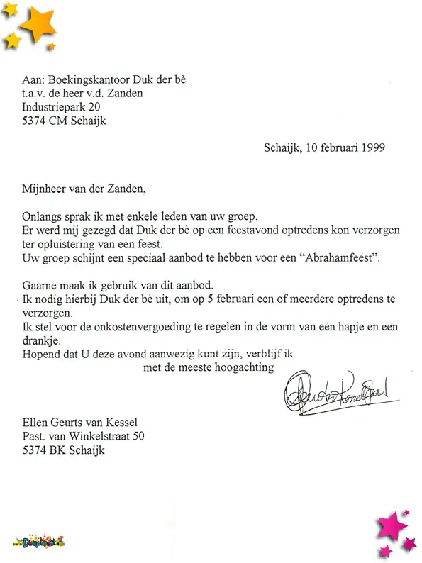 Ellen Geurts van Kessel was wel op de hoogte en stuurde deze brief naar het boekingskantoor van Duk Dur Be.