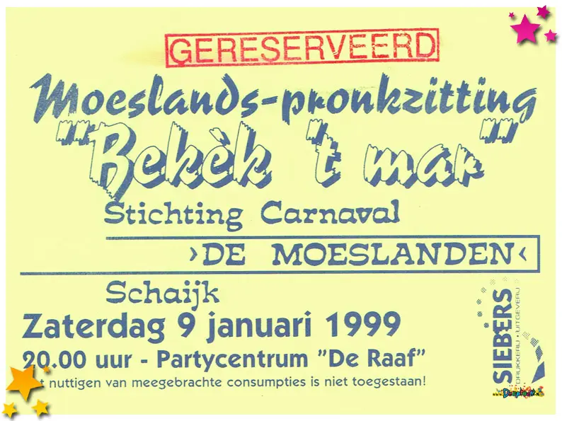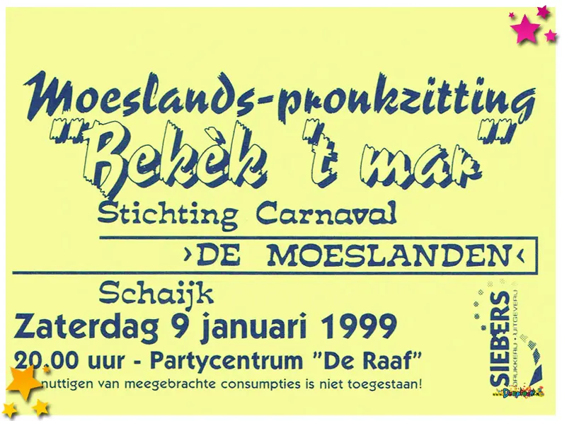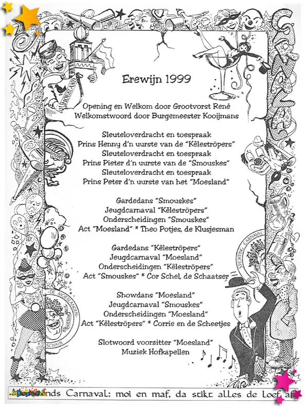 1999 gaat de boeken in als een van de meest spraakmakende jaren in de Moeslandse carnavalshistorie. De documenten en beelden uit dit jaar vertellen het verhaal van een dorp dat weet te shockeren, lachen én herinneringen vast te leggen – allemaal in één carnavalsweek.