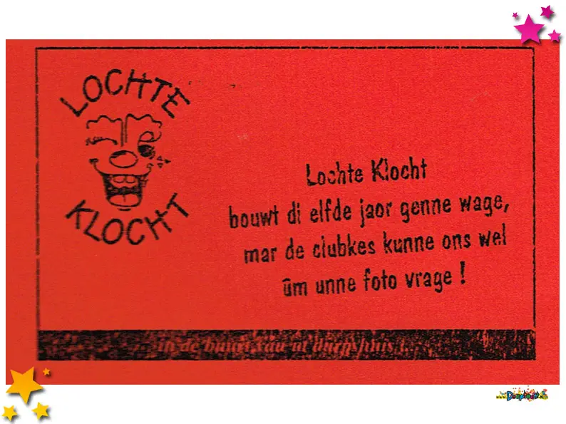 Carnavalsvereniging Lochte Klocht heeft in 1999 geen wagen gemaakt, maar ze maakten wel groepsfoto’s van alle deelnemers aan de optocht. Hiervoor werden deze flyers uitgedeeld.