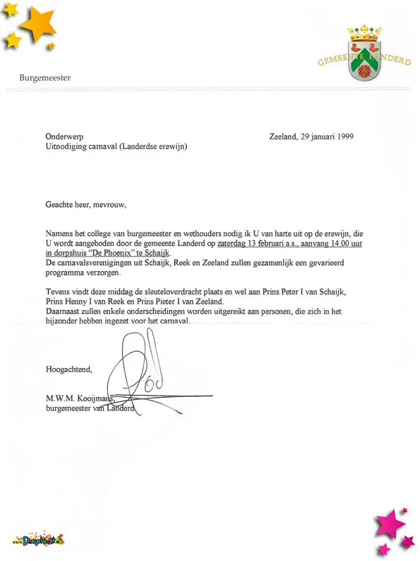 De officiële uitnodiging voor de Erewijn van de Gemeente Landerd.