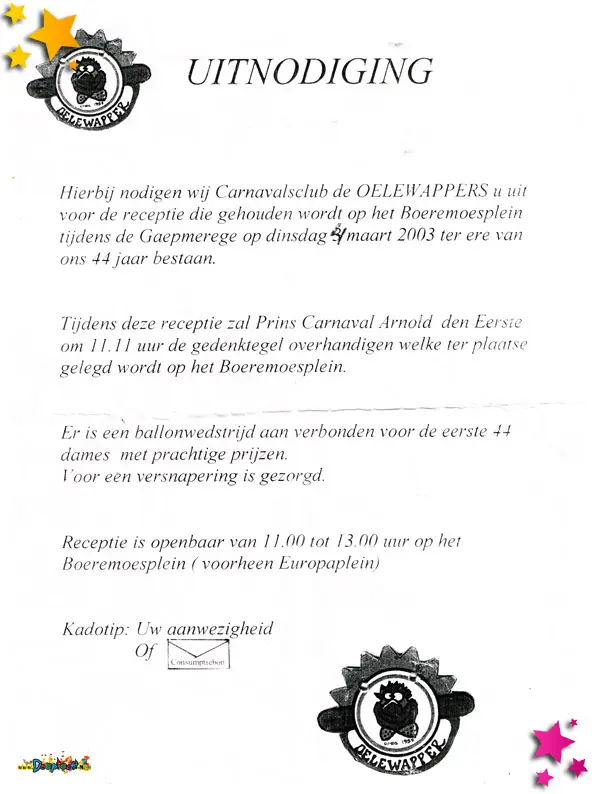 In 2003 bestond carnavalsvereniging de Oelewappers 44 jaar. Dit werd gevierd met een receptie op de Goapmerrege.