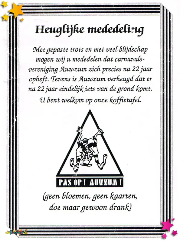 Na 22 jaar vond carnavalsvereniging Auwzum het wel mooi geweest: Auwzum heft zich op. En dat deden ze dan ook letterlijk. Tijdens de optocht werd Auwzum d.m.v. een hijsbak omhoog getakeld door Van Grinsven met een grote kraan.