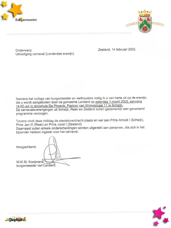 De officiële uitnodiging voor de Erewijn, ofwel de sleuteloverdracht, in Schaijk.