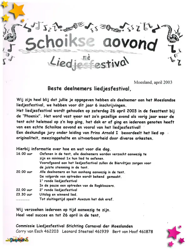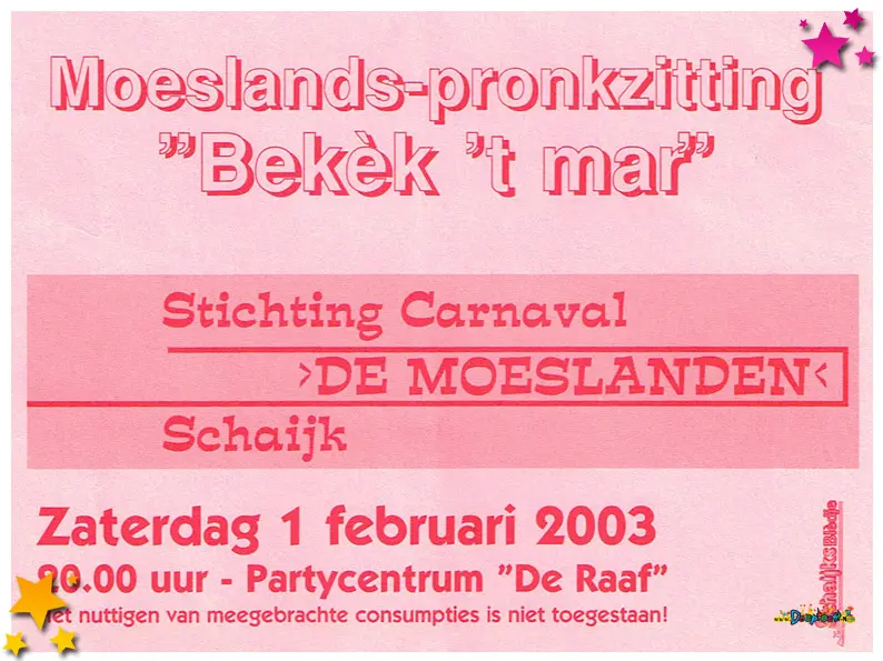 Het programma voor het Moesbal dat op carnavalszaterdag 2003 werd gehouden.