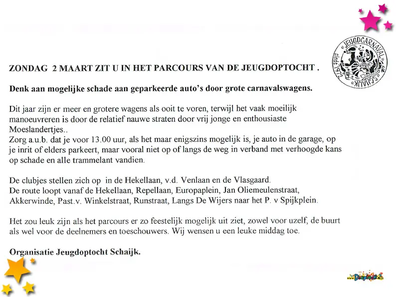 Jeugdcarnaval Schaijk stuurde alle omwonenden aan de route van de jeugdoptocht deze informatie per brief.