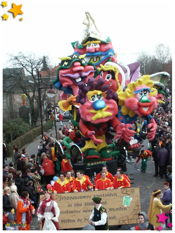 Een bijzonder moment was de opheffing van Carnavalsvereniging Auwzum. Niet zomaar een stil einde, maar een ceremonieel afscheid op geheel eigen wijze: Auwzum liet zich letterlijk en figuurlijk ‘opheffen’ door kraanverhuurbedrijf Van Grinsven BV. Met een knipoog en een hijskraan werd de club de lucht in getild, een passend slotakkoord voor een club die het Moesland jarenlang kleur gaf met creatieve acts, humorvolle optredens en ludieke ludiekheid. Overigens was Auwzum in 2004 gewoon weer van de partij.