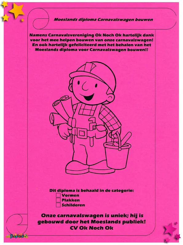 Een van de meest opvallende documenten uit dit jaar is het diploma voor het publiek van Ok Noch Ok. Tijdens de optocht gaven zij een creatieve draai aan hun deelname: hun carnavalswagen werd live ‘gebouwd’ door het publiek zelf. Met gaas, ijzer, plak, verf en ludieke instructies lieten ze de toeschouwers langs de route letterlijk deel uitmaken van hun act. Iedereen die meehielp, kreeg een officieel diploma als bewijs van bouwkundige bekwaamheid op z’n Moeslands, uiteraard. Een unieke en interactieve ervaring die de optocht dit jaar extra bijzonder maakte.